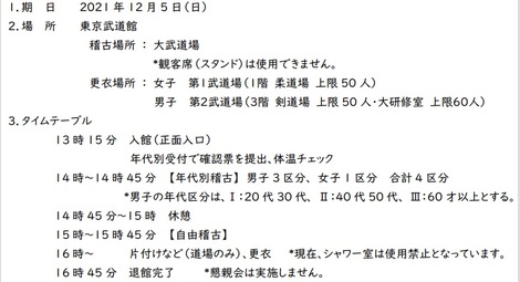 2021年12月5日、OB戦が中止となった東京武道館で稽古会が実施されます。特徴は下記の通り。